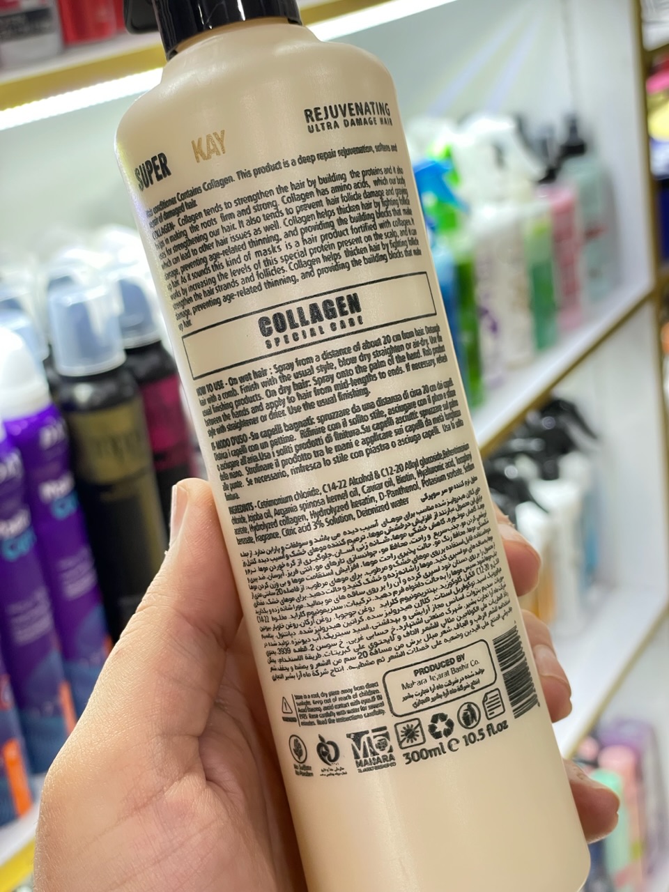 اسپری مو کلاژن 300 میلی لیتر سوپرکی SUPER KAY تارهای مو را نرم نموده و فرایند ترمیم بافت آسیب دیده مو را سرعت می بخشد. این محصول با آبرسانی عمقی خود خشکی را از بین برده و مانع از وز شدن مو می گردد. این اسپری جلوی پیری زودرس مو را گرفته و یک محافظت همه جانبه از مو به عمل می آورد. این محصول به راحت تر شانه شدن تارهای مو کمک می نماید و فرایند حالت گرفتن مو را ساده می سارد. این اسپری جذب سریع و راحت دارد و کلاژن موجود در آن به خوبی جذب می شود.